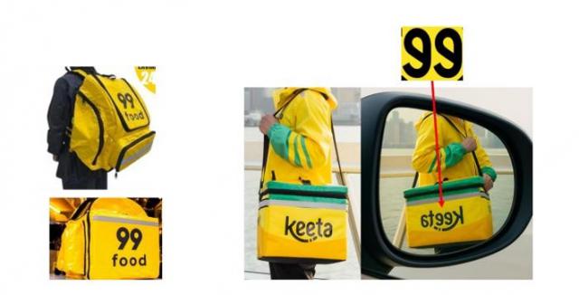 最近一场则是 99Food 起诉 Keeta,认为 Keeta 在颜色、图形与字体上刻意模仿 99Food,易使消费者混淆,其中一条理由是"后视镜中 Keeta 的 ee,是 99 "。