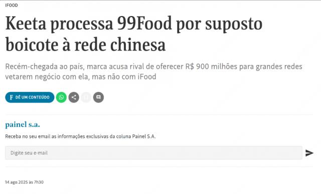 图:据《圣保罗页报》报道,滴滴 99Food 目前在当地已提供至少 9 亿雷尔(近 12 亿元人民币)的预付款,换取针对 Keeta 而不限制 iFood 的"二选一"排他协议