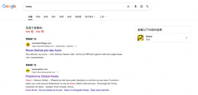 除了在商户侧搞"二选一",滴滴 99Food 也尝试从用户侧掐断 Keeta 的流量来源。方法就是通过在 Google 上高价购买" Keeta "关键词,以混淆其搜索结果,当用户搜索" Keeta "时会优先显示 99Food 的广告,这一方法被 Keeta 诉至法院后勒令停止。