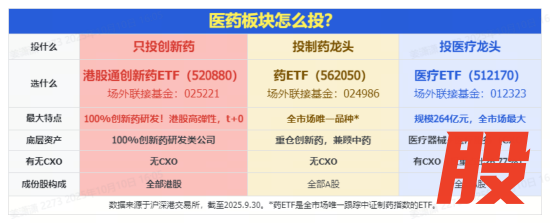 注:根据沪深交易所数据,截至2025.9.30,医疗ETF规模264亿元,在全市场医药类ETF中规模最大(1/50)。药ETF是全市场首只也是目前唯一跟踪中证制药指数的ETF。