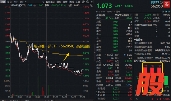 A股创新药相对抗跌,通化金马、海思科、信立泰逆市收涨,全市场唯一药ETF(562050)重仓创新药,场内收跌1.56%跑赢大市。全天基本全时段溢价交易,反映买盘势力较强。