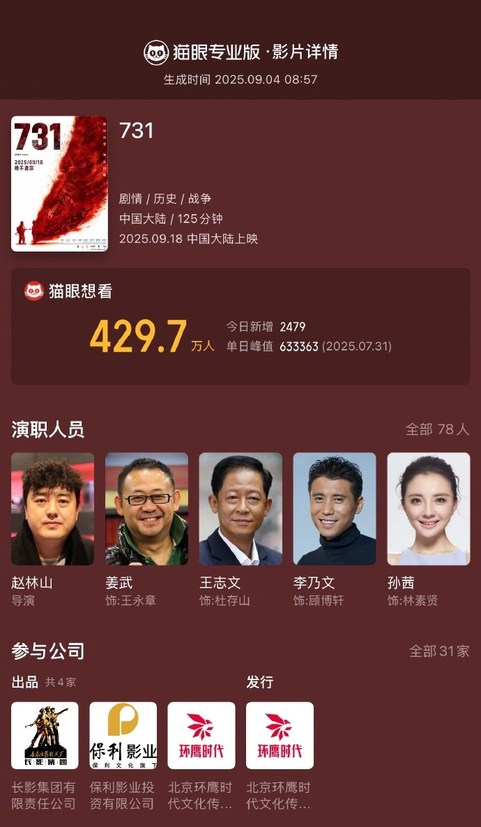 9月4日,据灯塔专业版红启网,影片《731》发行通知出炉,片长125分钟,将于9月18日上映。