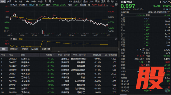 成份股方面,畜牧养殖、动保、食品及饲料添加剂等板块部分个股跌幅居前。截至收盘,兄弟科技大跌7.16%,晓鸣股份跌近5%,巨星农牧跌超3%,瑞普生物、华英农业、万向德农等多股跌超2%。